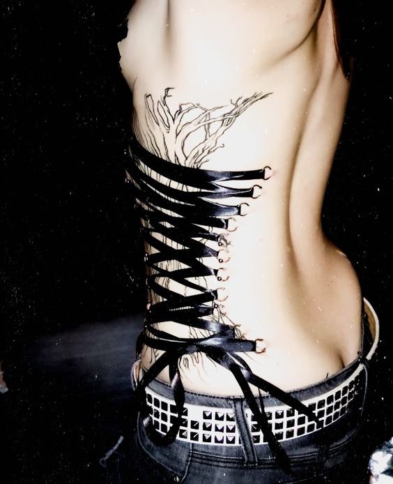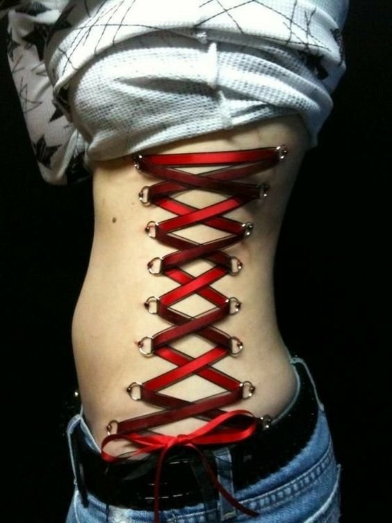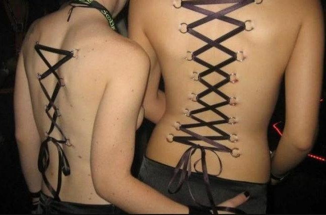 Отделно си струва да се отбележат сложните видове плоскостни пиърсинги, например корсет. Няколко пиърсинга са разположени на гърба. Бижутата са свързани с лента, която създава имитация на корсет. Широко разпространени са плоските пиърсинги на гениталиите и пубисната област.