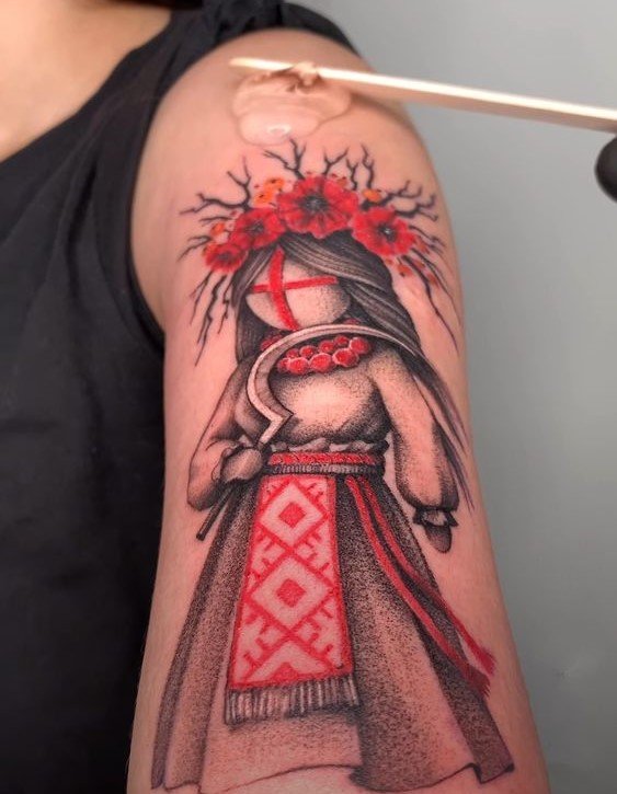 - татуировката на българска бродерия често се допълва от символични изображения на атрибутите на шевицата - обръчи, конци, игли.