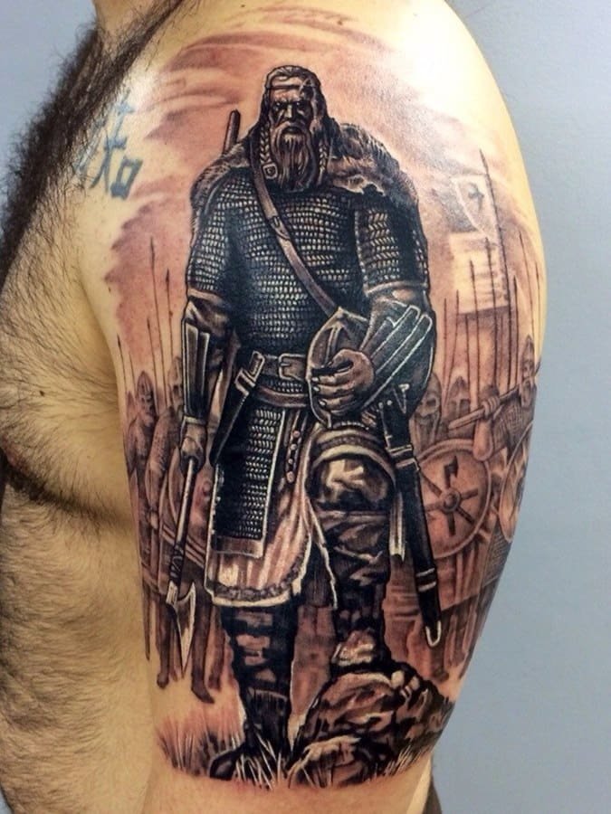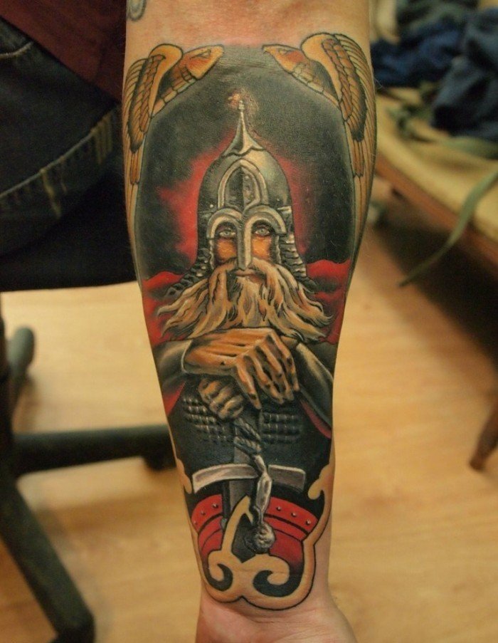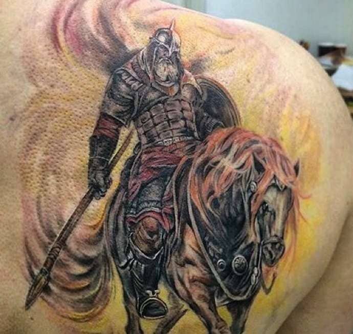 Татуировката на богатира подчертава силните черти на характера на своя собственик. Такава рисунка върху тялото характеризира човек като справедлив човек, той никога няма да ви разочарова, ще помогне в трудни моменти. Мъжете, които са избрали тази скица за изображение върху тяло, като правило са добри съпрузи, които по-късно ще предадат най-добрите си качества на децата си.