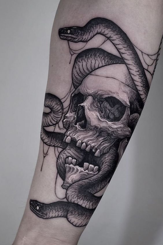 Ако на татуировка е изобразен череп със змия, излизаща от очната му ямка, това символизира безсмъртие и мъдрост и подсказва, че знанията и опитът ни остават на земята и след смъртта ни.