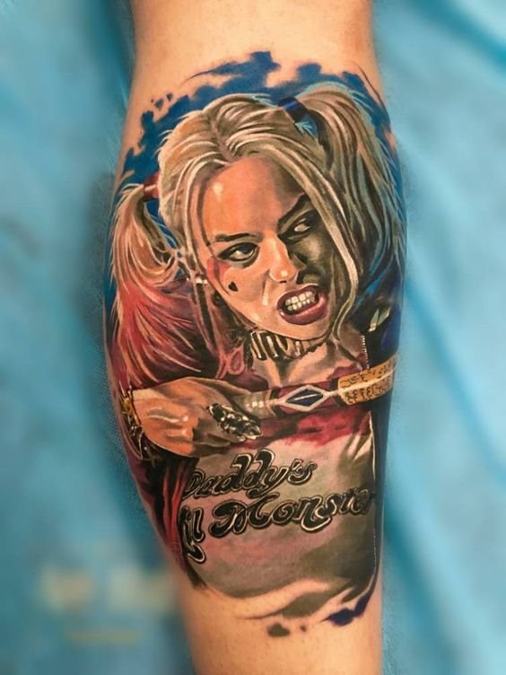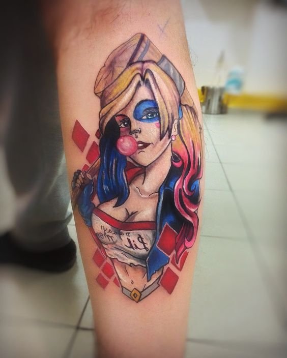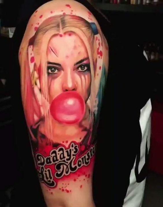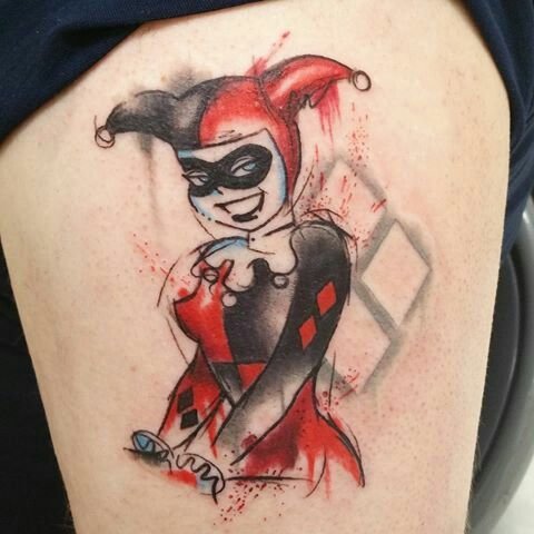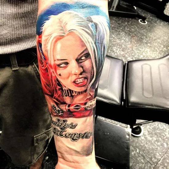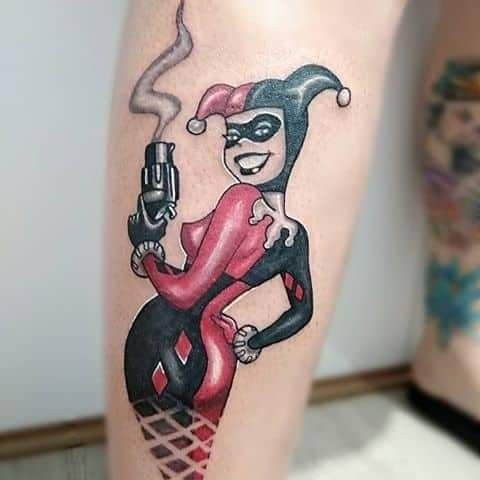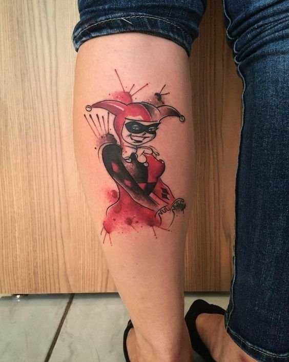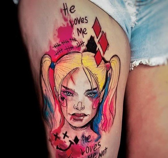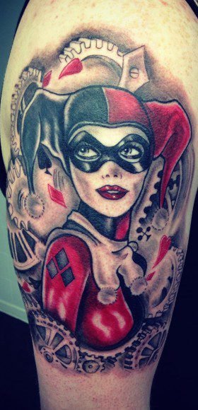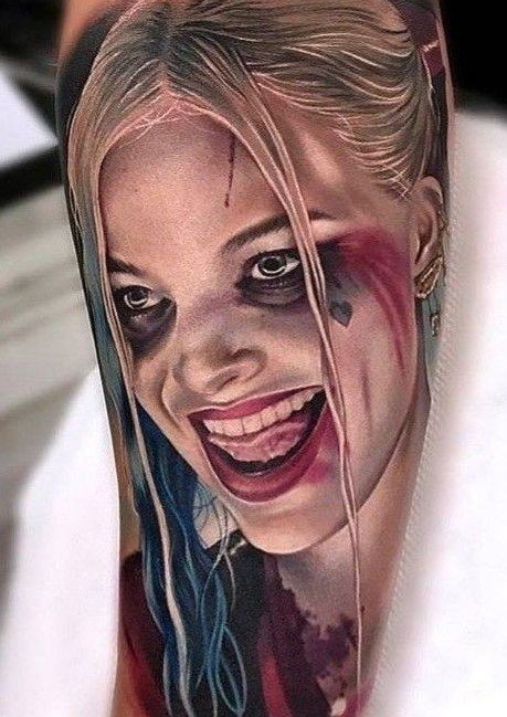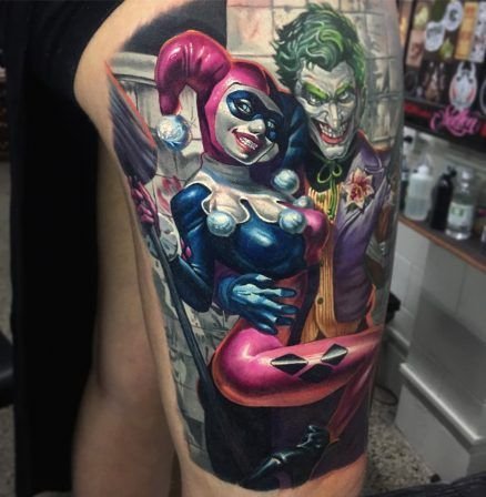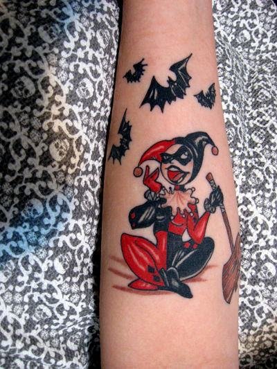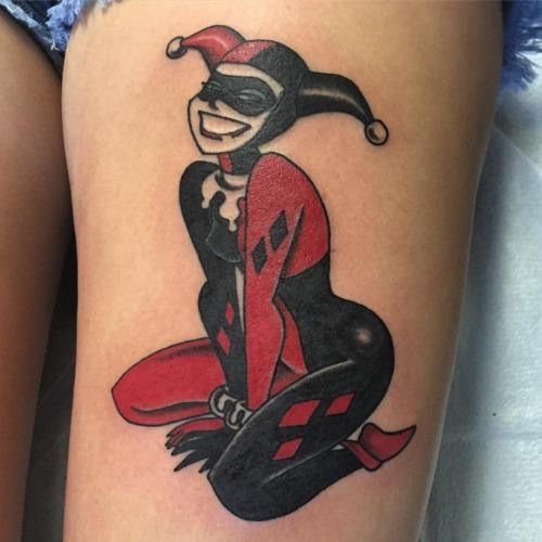 - Харли Куин. Вярна приятелка на Жокера. Харли има невероятна гъвкавост и сила, така че татуировка с нейния образ означава силата на личността и духа. Освен това Куин е необичайно умна и съблазнителна. Харли от известния филм "Отряд самоубийци" носи обозначението на безстрашие, сила и готовност за саможертва. Има изображения на Харли с приятел на име Отровен бръшлян. Близка приятелка възнагради Куин със способността да устои на всички отрови, което направи Харли още по-силна. Носеното изображение на две верни приятелки носи интерпретация на преданост, както и невероятна издръжливост. Куин и Жокера в татуировка носят интерпретация на трагична любов, тъй като Жокера използва момичето изключително за собствените си цели. Има и скици на татуировки не на самата героиня, а на нейните символи: ромби, черно сърце и надпис "rotten" (гнило).