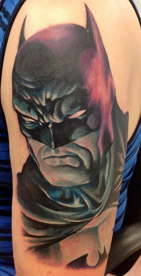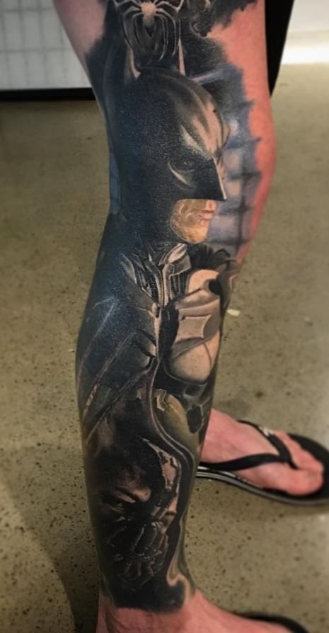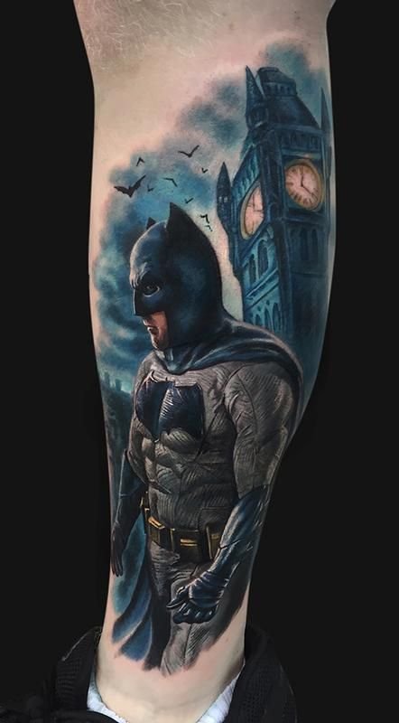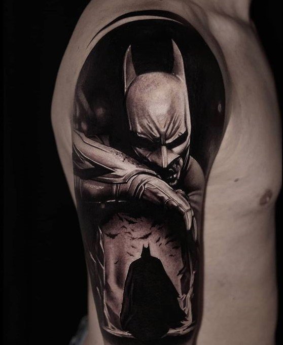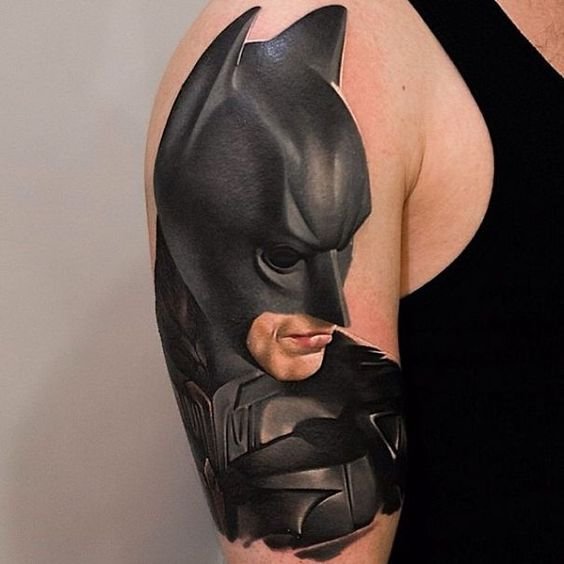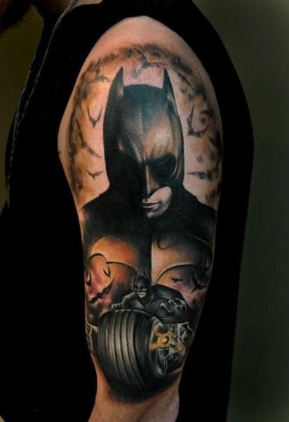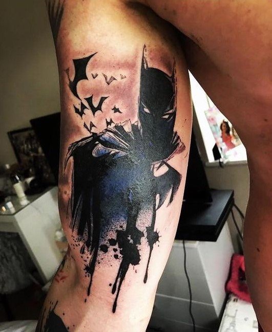 - Батман. Най-известният герой, който за първи път се появява в комикси през 1939 г. Известният борец за справедливост е „другото аз“ на Брус Уейн, който живее в Готъм. Черният рицар на нощта няма супер сили, хитростта му е в задълбочените познания по бойни изкуства, както и в съвременните технологии, които използва. Ето защо татуировката с Батман е знак за увереност, смелост и остроумие. В допълнение към самия супергерой, татуировките често съдържат изображение на логото: черен овал с жълт фон, на който се намира прилепът, което промени много пъти. Първоначално супергероят беше в сив костюм, който беше допълнен от жълто-синьо наметало. Оттогава костюмите са се променяли многократно. Днес Батман е известен на всички с мрачния си черен костюм.Има и скици за татуировки, в които тъмният рицар е изобразен заедно с Робин, асистент и приятел по същото време. Робин е изобразен в цветни костюми, което ефективно подчертава мрачния външен вид на Батман.