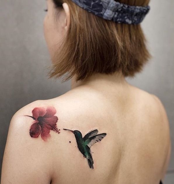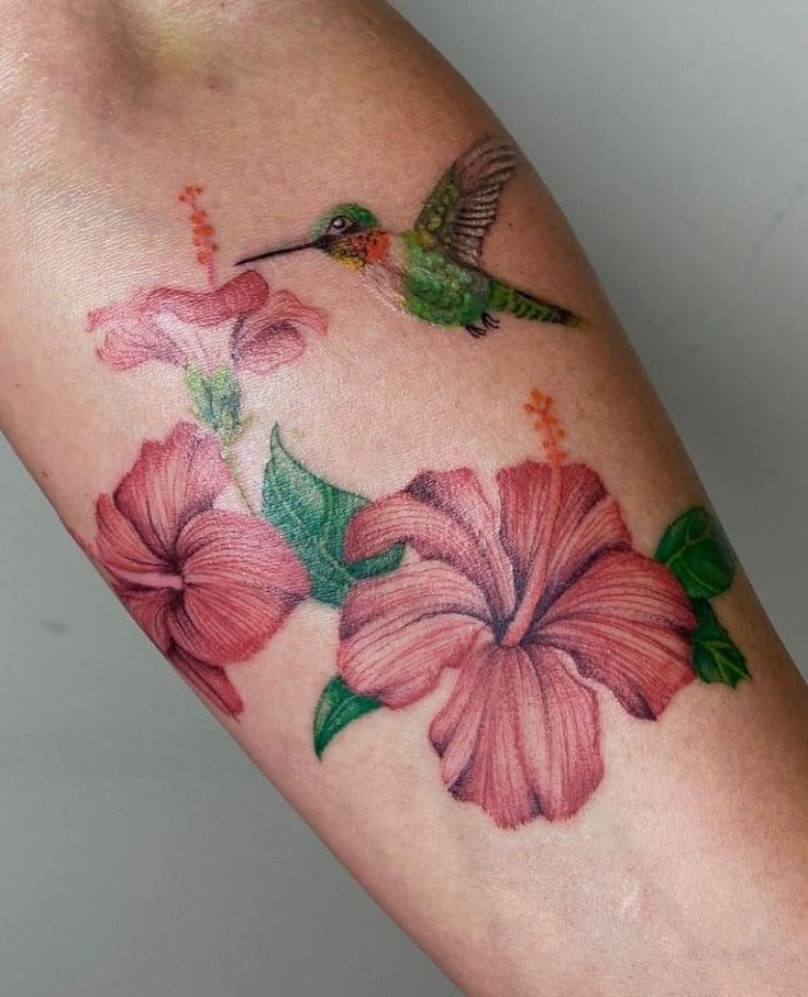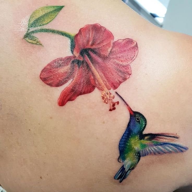 - Хибискусът и екзотични птици като колибри или папагали създават ярка и хармонична комбинация. Това е татуировка, която обединява символиката на свободата и екзотиката. Птиците, летящи около цветето, могат да добавят допълнителен смисъл, символизирайки стремежа към приключения, вдъхновение и високи цели.