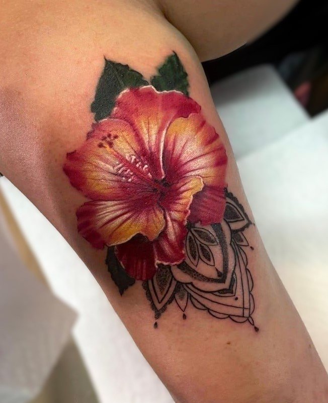 - Мандалата е мощен символ, който означава цялост, хармония и баланс. В съчетание с хибискус, който вече носи значение на красота и хармония, мандалата става перфектното допълнение. Татуировка с този дизайн не само ще бъде красива, но и ще има дълбок смисъл, отразявайки стремежа към вътрешно равновесие и духовно развитие.