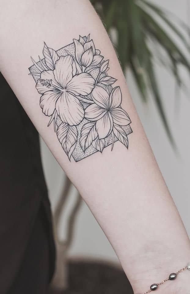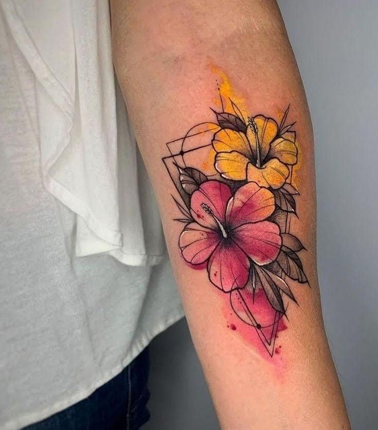 - Хибискусът може да се комбинира перфектно с геометрични фигури, което придава на татуировката съвременен и стилен вид. Геометрията добавя структура и симетрия, а хибискусът в съчетание с тези елементи може да изглежда изключително динамично. Например, цветето може да бъде изобразено в кръг или обградено от триъгълници, което добавя дълбочина на татуировката.