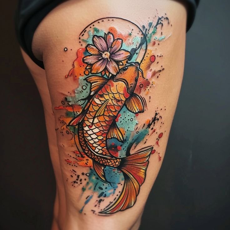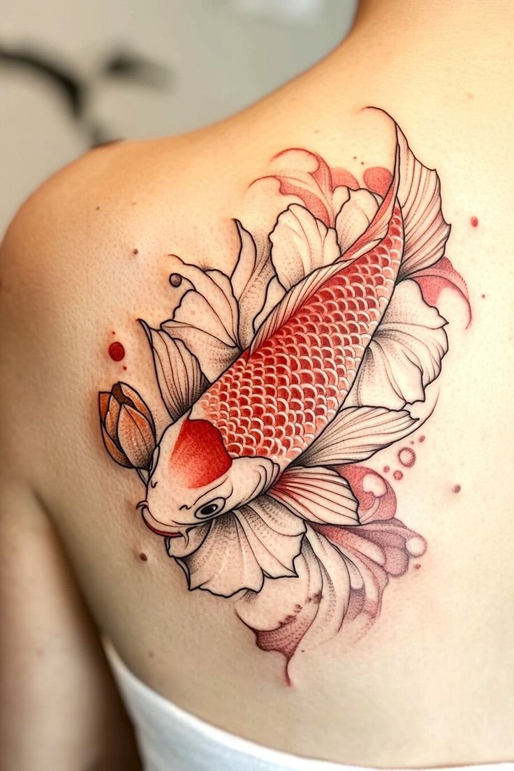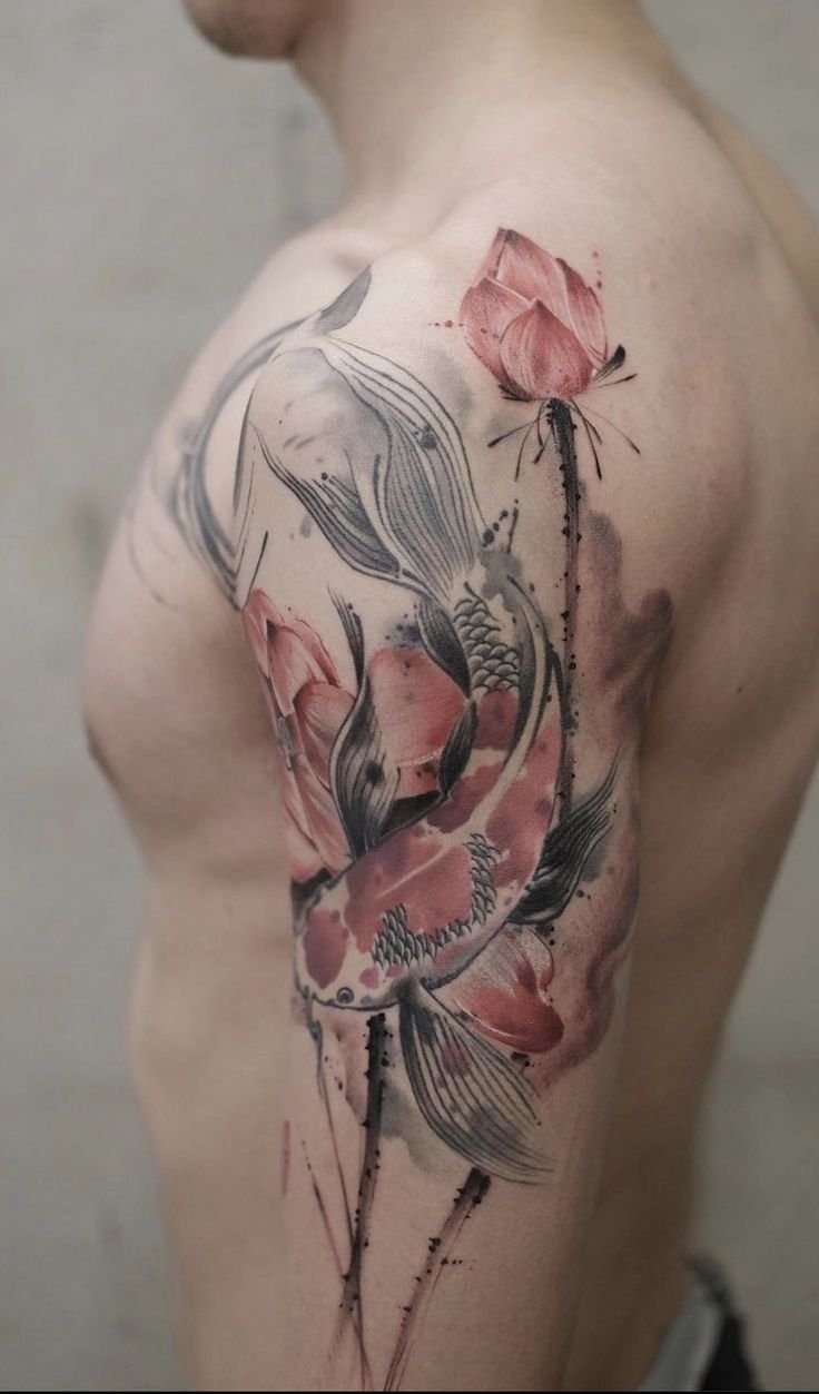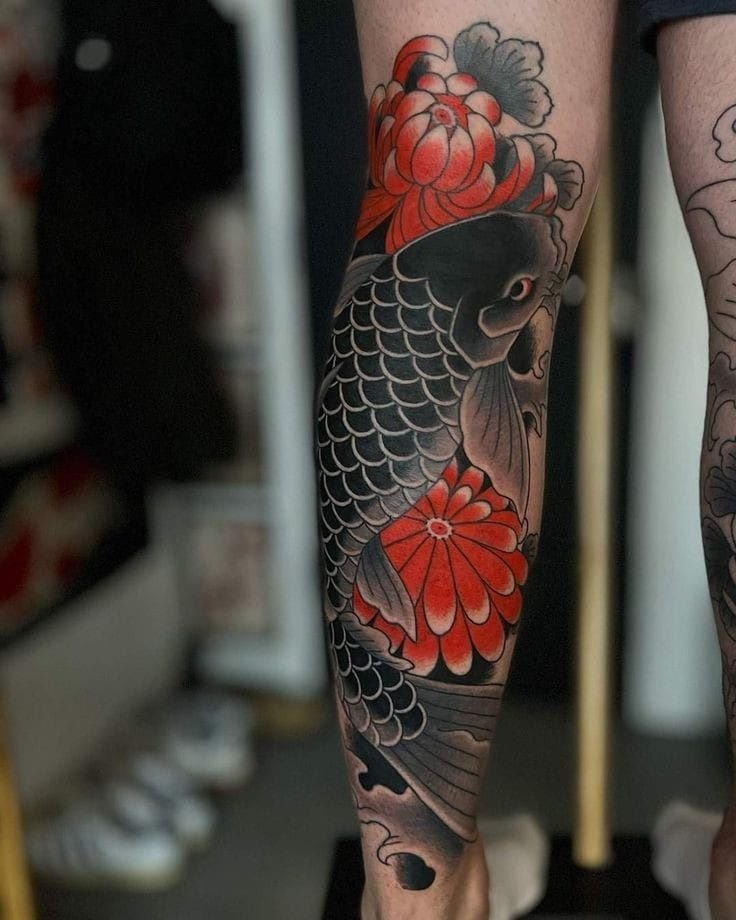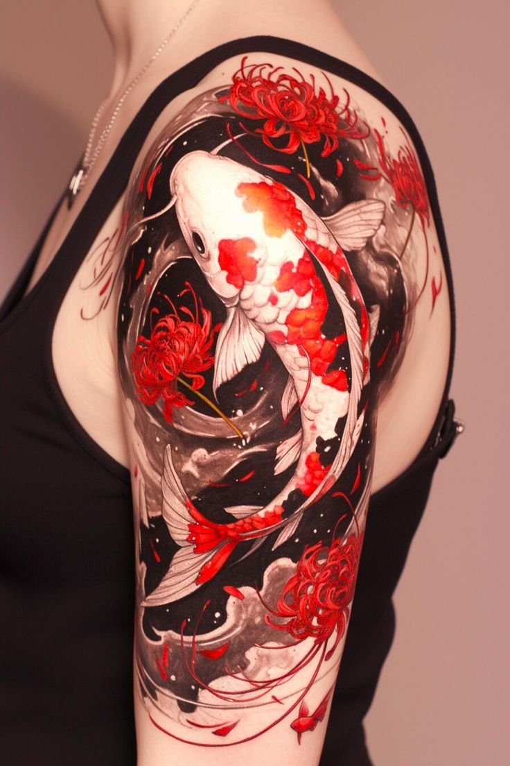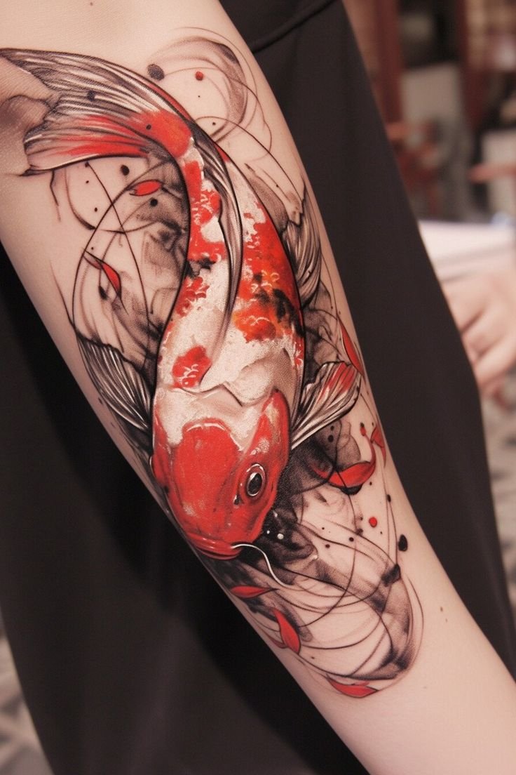 - Карп Кои е не само символ, но и изключителен обект за създаване на татуировка. Тялото на рибата с нейните перки и люспи е идеално за създаване на детайлни и ярки изображения. Татуировките с карп Кои обикновено са ярки и наситени, използвайки нюанси на червено, оранжево, синьо и черно. Тези татуировки могат да бъдат изпълнени в различни стилове – от традиционния японски до по-съвременни интерпретации. Карп Кои може да бъде изобразен на всякакви участъци от тялото – от гърба и гърдите до краката и раменете. Често изображението на карпа се комбинира с други елементи като цветя сакура, водопади, облаци или вълни, което още повече засилва смисъла и визуалната привлекателност на татуировката.