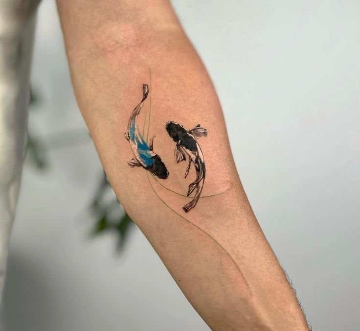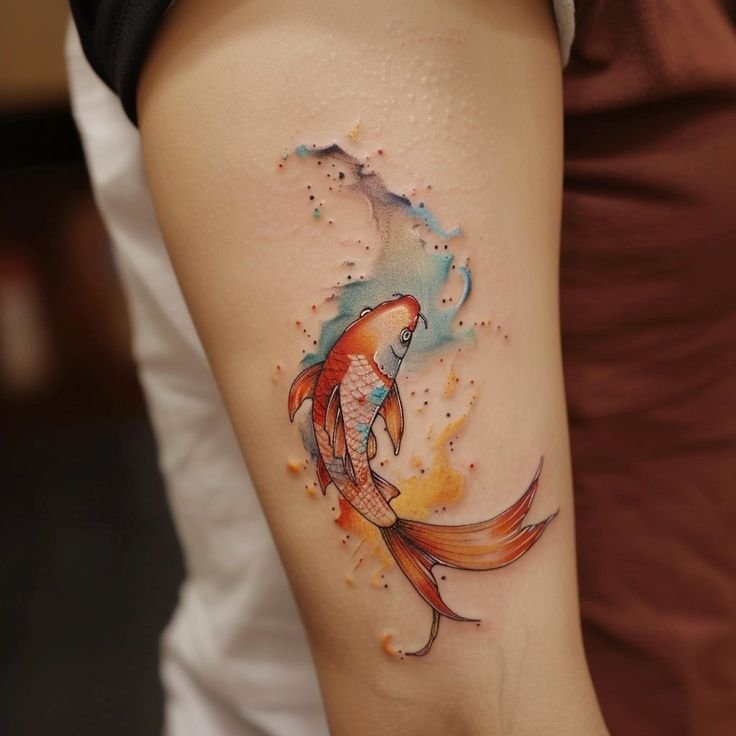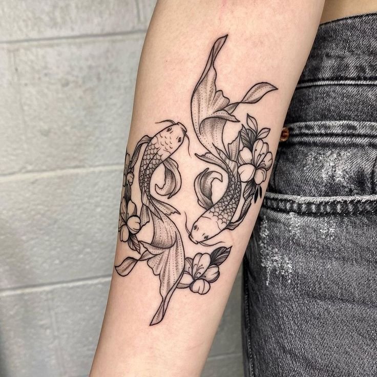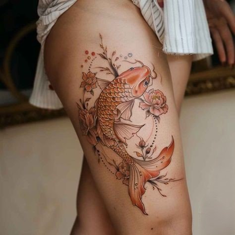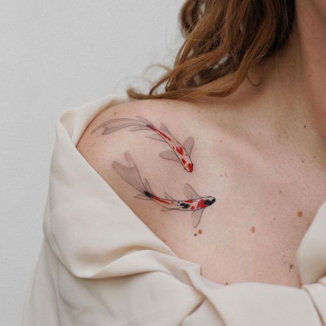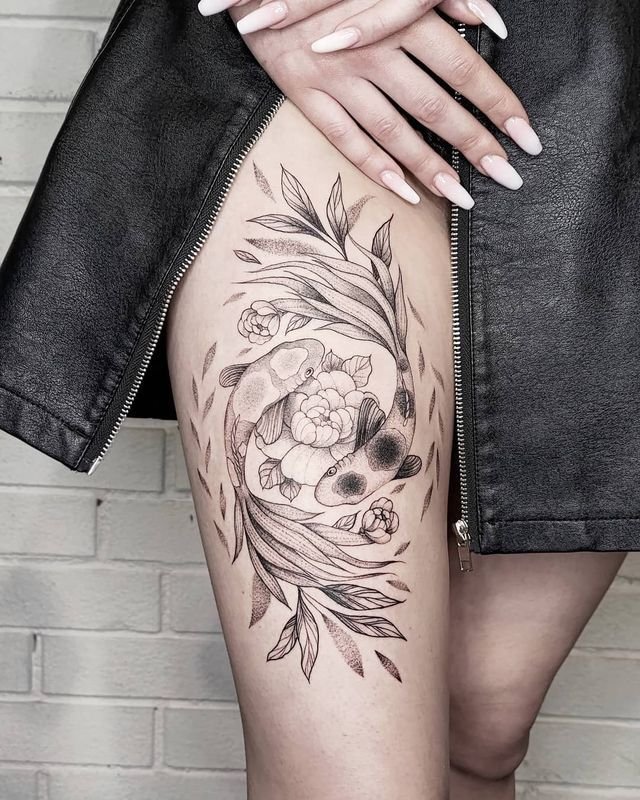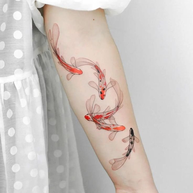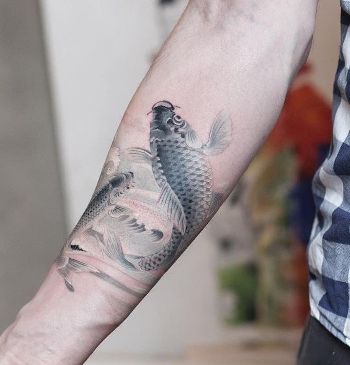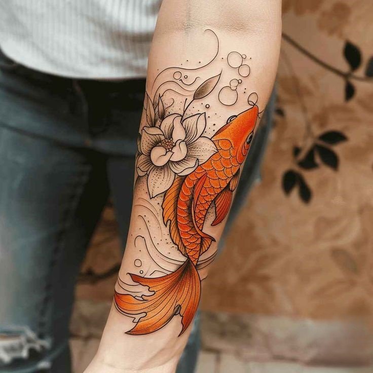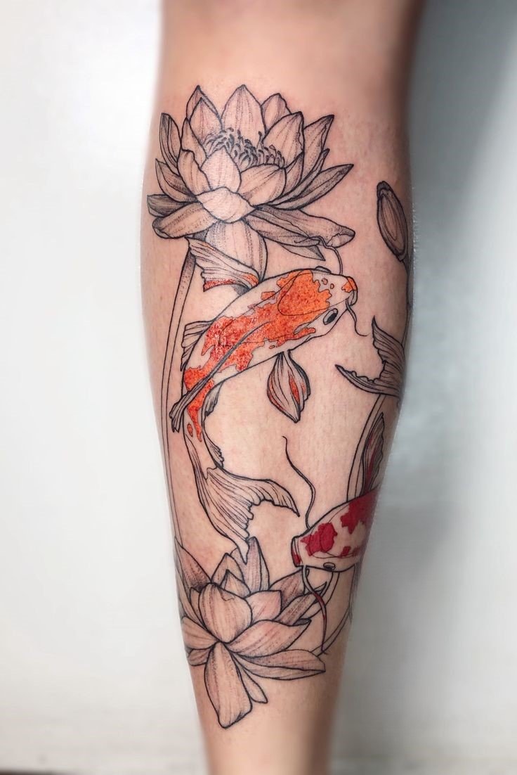 - Карп Кои е не само символ, но и изключителен обект за създаване на татуировка. Тялото на рибата с нейните перки и люспи е идеално за създаване на детайлни и ярки изображения. Татуировките с карп Кои обикновено са ярки и наситени, използвайки нюанси на червено, оранжево, синьо и черно. Тези татуировки могат да бъдат изпълнени в различни стилове – от традиционния японски до по-съвременни интерпретации. Карп Кои може да бъде изобразен на всякакви участъци от тялото – от гърба и гърдите до краката и раменете. Често изображението на карпа се комбинира с други елементи като цветя сакура, водопади, облаци или вълни, което още повече засилва смисъла и визуалната привлекателност на татуировката.