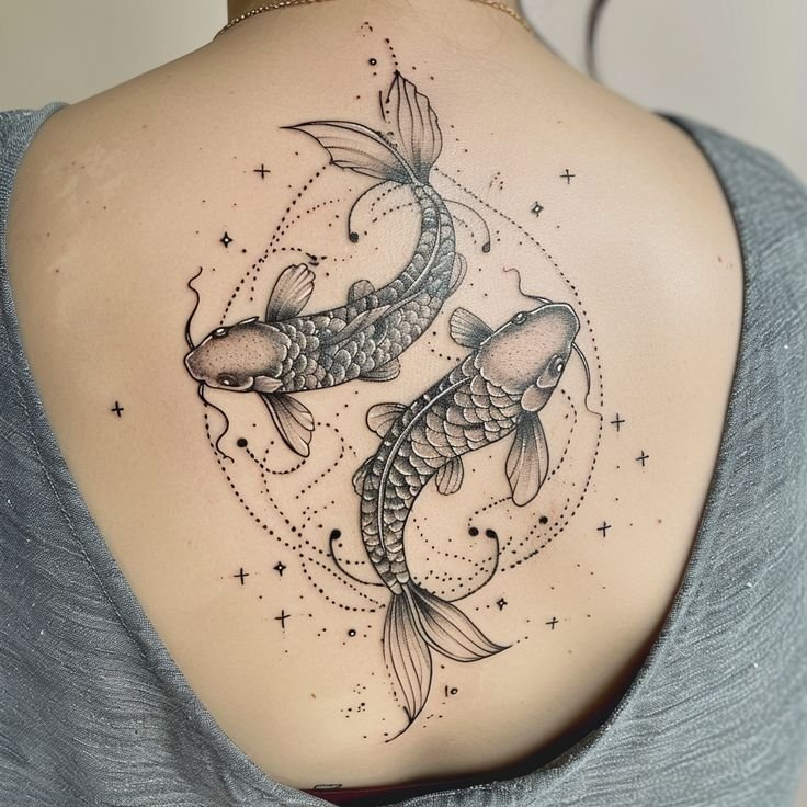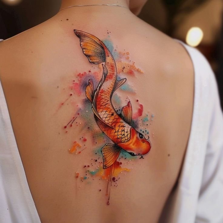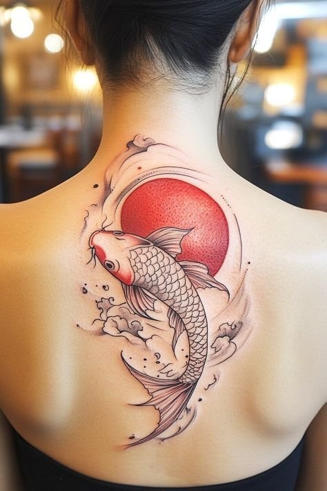- Татуировката с карп Кои на гърба е класически избор. Гърбът предоставя достатъчно пространство за създаване на цялостен и детайлен рисунък, който ще изглежда красиво в всяка позиция на тялото. Често се изобразява карп, който плува нагоре, символизирайки стремеж към успех и преодоляване на препятствия.