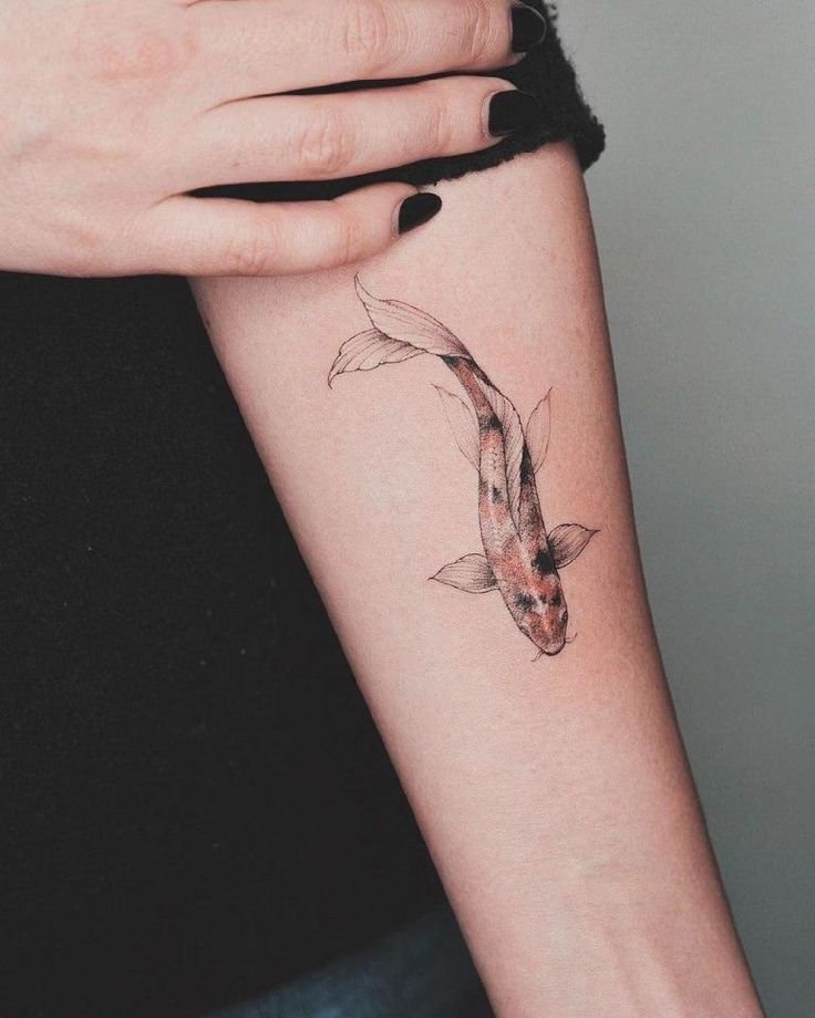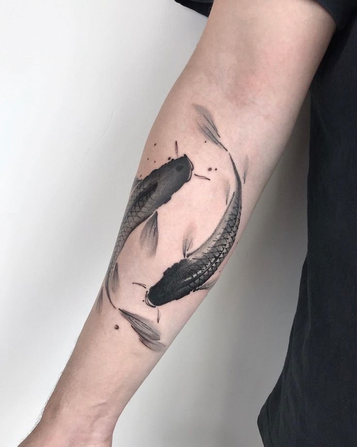 - Ръцете и раменете са още едно популярно място за татуировка с карп Кои. Тези участъци от тялото позволяват да се направят по-компактни татуировки, които ще бъдат забележими, но не прекалено обемни. Ръката е идеална за изображение на карп в движение, символизиращ напредък и развитие.