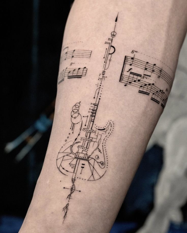 Татуировките с музикална тематика могат да бъдат както минималистични, така и сложни, с множество детайли.