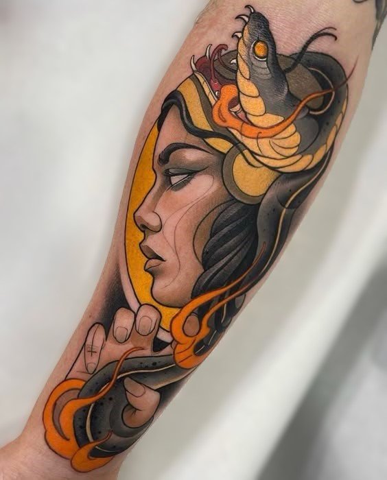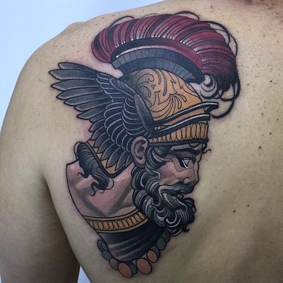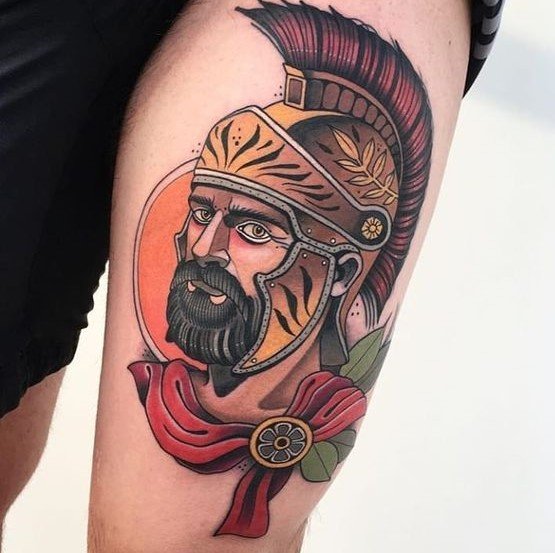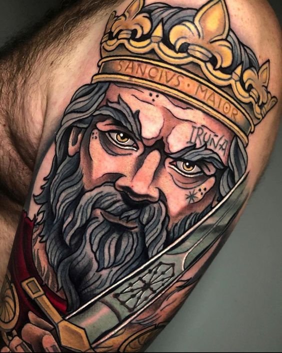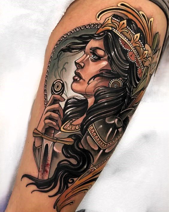 Мъжките татуировки в стил нео-традишнл често включват силни образи и символи на мощ: