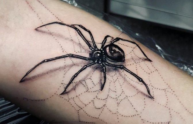 - Blackwork. Стилът с толкова красноречиво име предлага особено ярки и експресивни изображения на членестоноги, изпълнени под формата на силует, изпълнен с черен пигмент, или ясно очертан контур без фини детайли. Важно е да се помни, че от татуировка в стил Blackwork не трябва да се изисква изящество и лекота: такива татуировки по природа винаги гравитират към агресивна тежест. Изображението на самия паяк заема централно място.