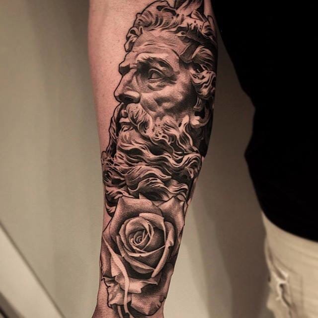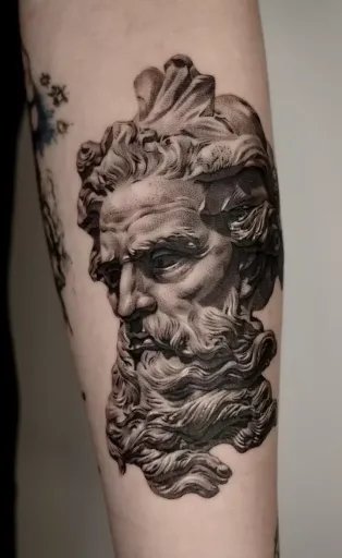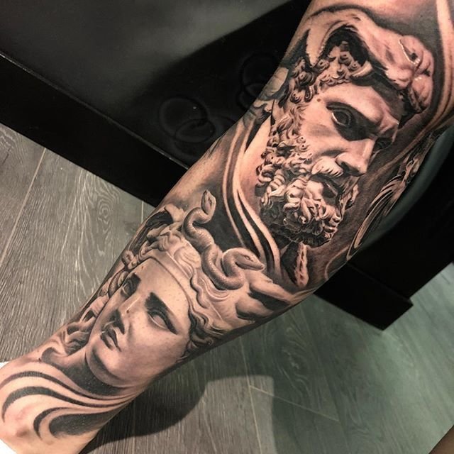 В зависимост от изпълнението, такава татуировка ще изглежда еднакво добре на мъже и жени. Гръцките богини и богини ни очароват и до днес. Подобен избор демонстрира академична красота, свобода, сила и дух на победа. Образът на скулптурите се изпълнява, като правило, в черни и сиви портретни стилове. Анатомично правилни атлетични пропорции на тялото, струящи се дрехи, величие и грация. Напълно възможно е да се разбере универсалната любов и признание на самия стил и неговия източник.
