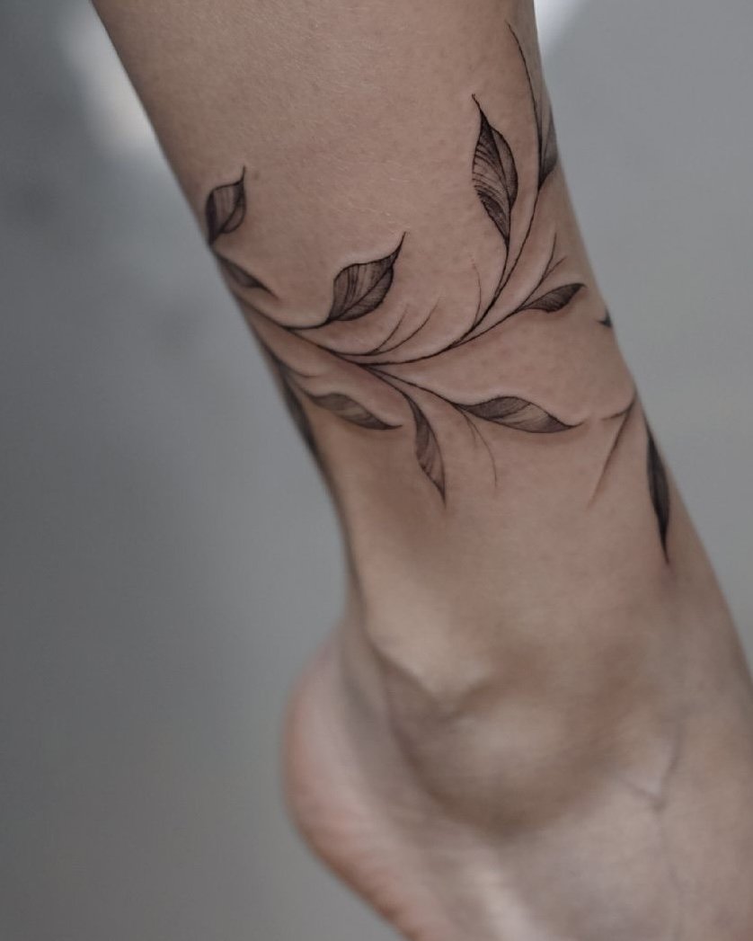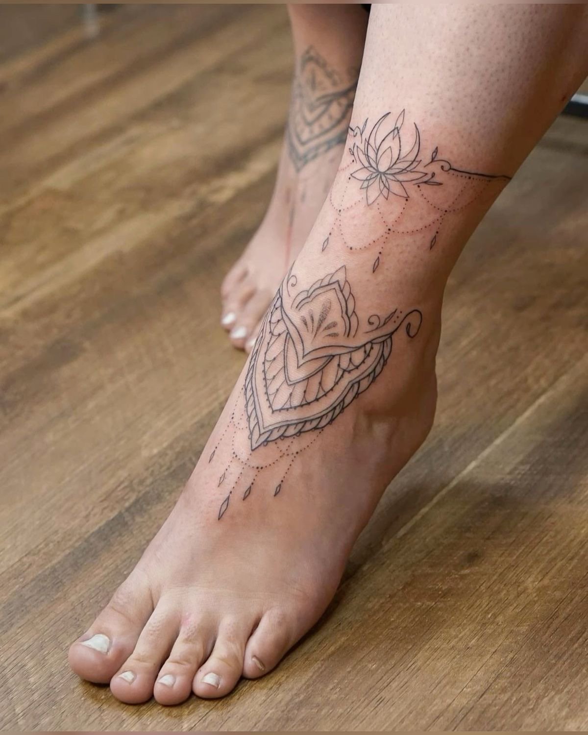 Такъв рисунък, обгръщащ крака, създава ефект на истинско украшение. Татуировката гривна на глезена може да бъде изпълнена във вид на тънка верижка, украсена с малки символи, или по-масивен орнамент, напомнящ на старинни украшения.