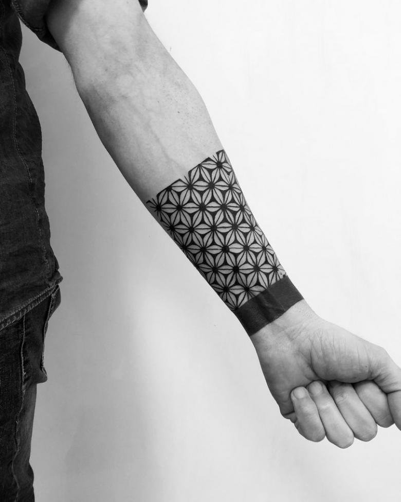 - Културата на татуировките изследва света на очарователни геометрични форми, като мандали, сложни спирали, удължени линии и др. Често тези обекти са комбинирани и зациклени. А основните форми се използват за създаване на по-големи и по-сложни геометрични композиции върху китката.
