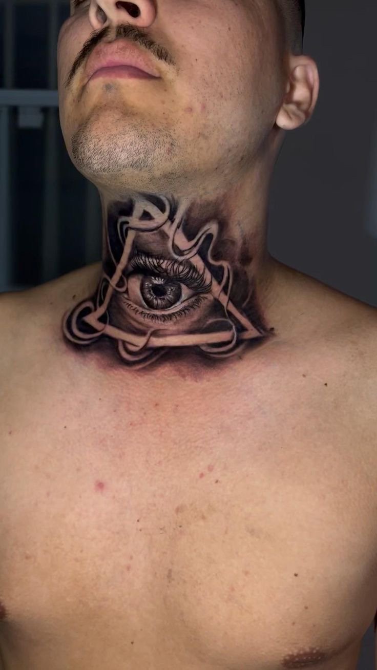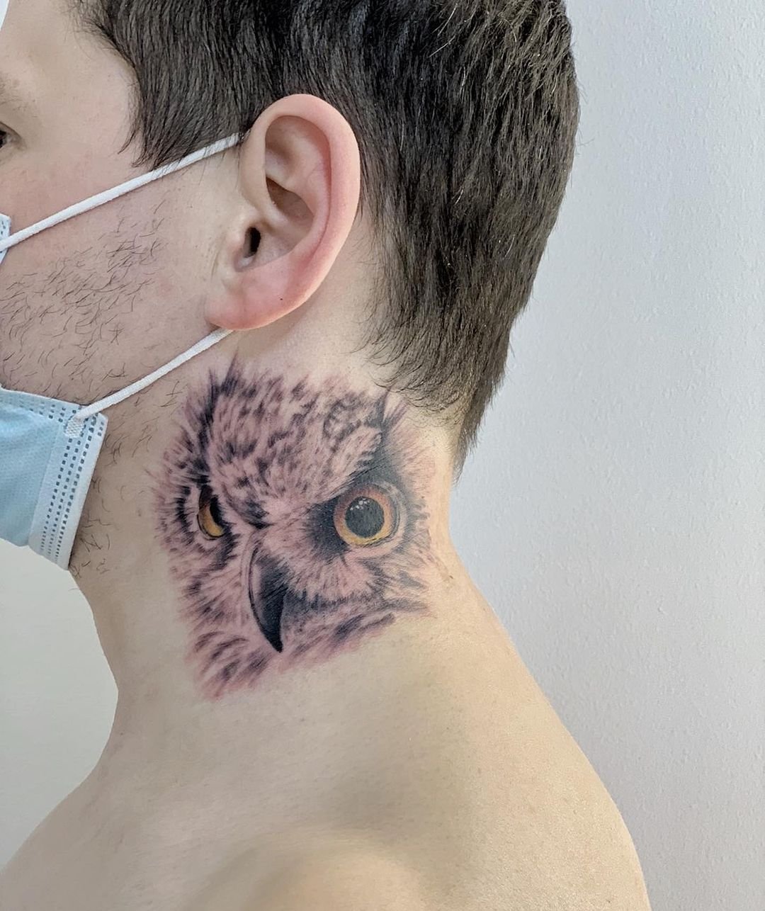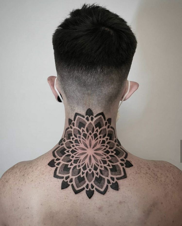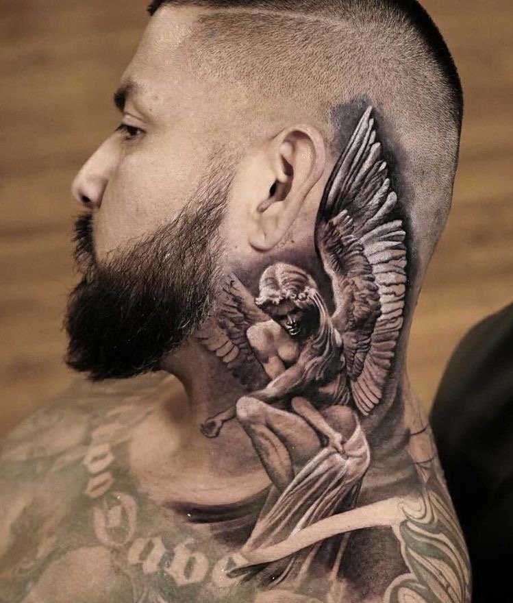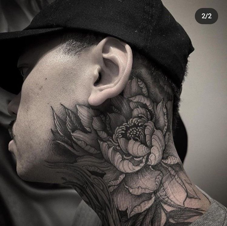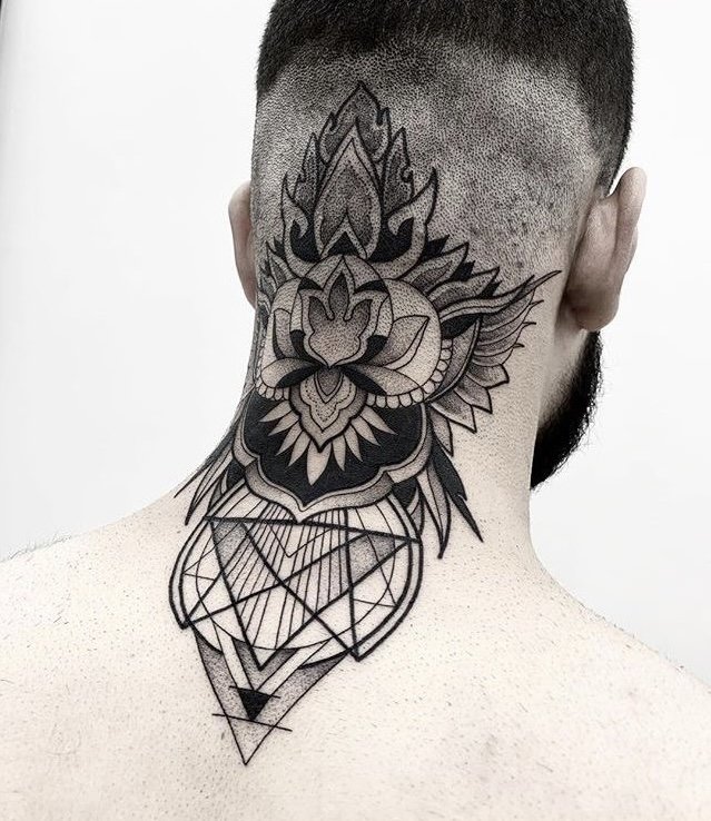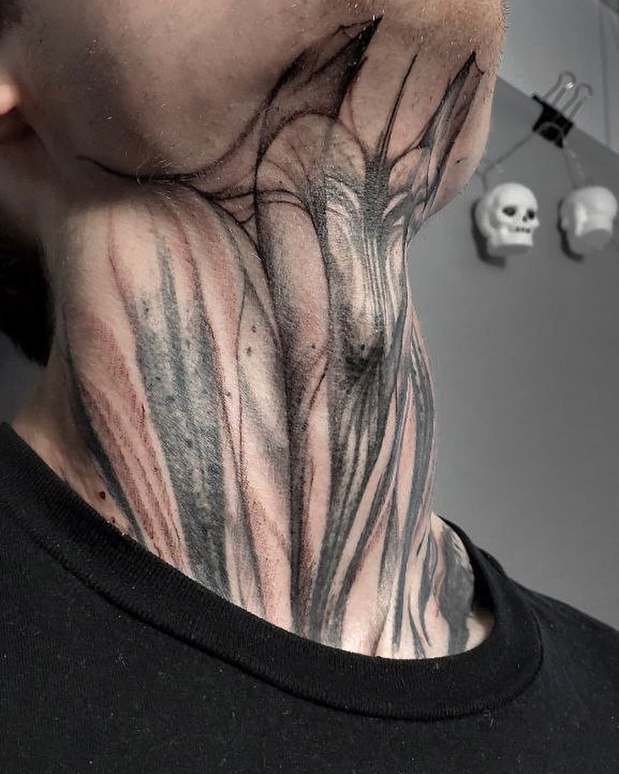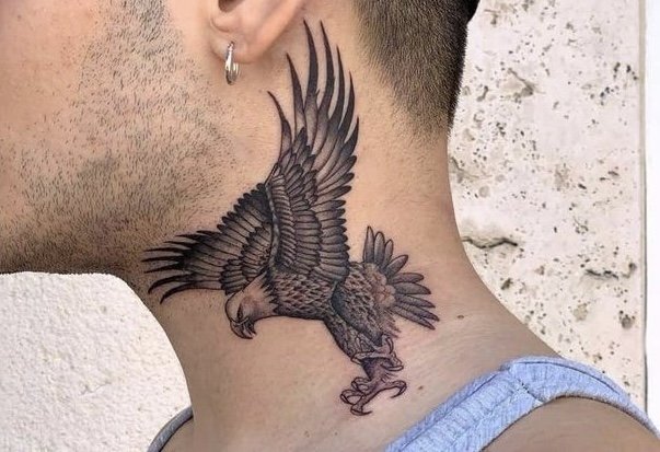 - Мъжките татуировки на шията привличат вниманието с реалистичните си дизайни, създавайки уникален визуален ефект. Обикновено това са масивни дизайни, които стигат до задната част на шията или дори до торса.