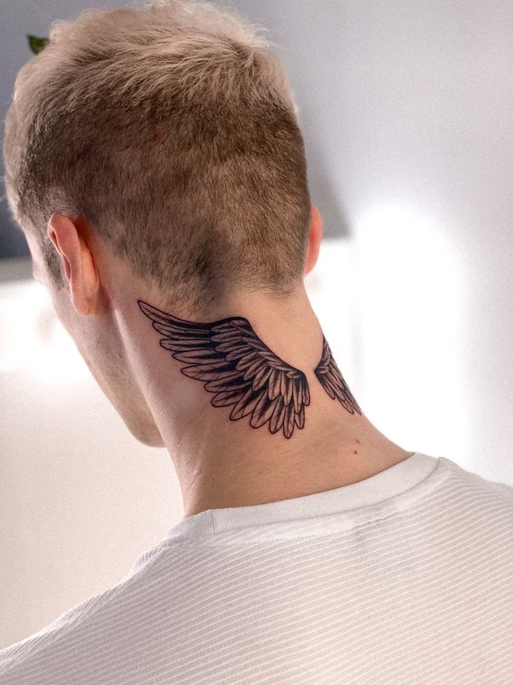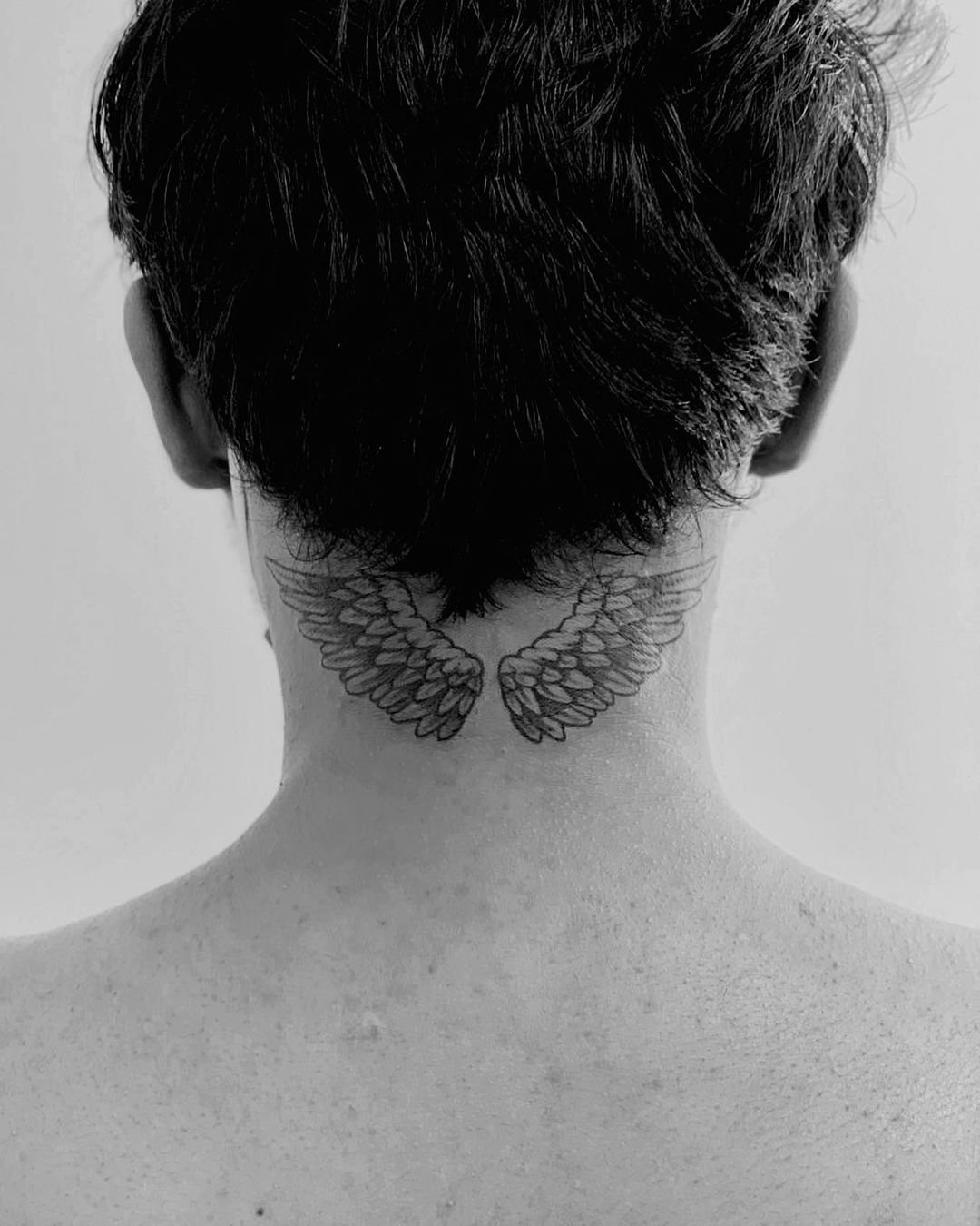 - Задната част на шията е популярно място за първите татуировки на момчетата, тъй като при необходимост лесно се прикрива. Можете също така да комбинирате татуировка на гърба с татуировка на предната част на гърлото в близост до адамовата ябълка за оригинален външен вид.