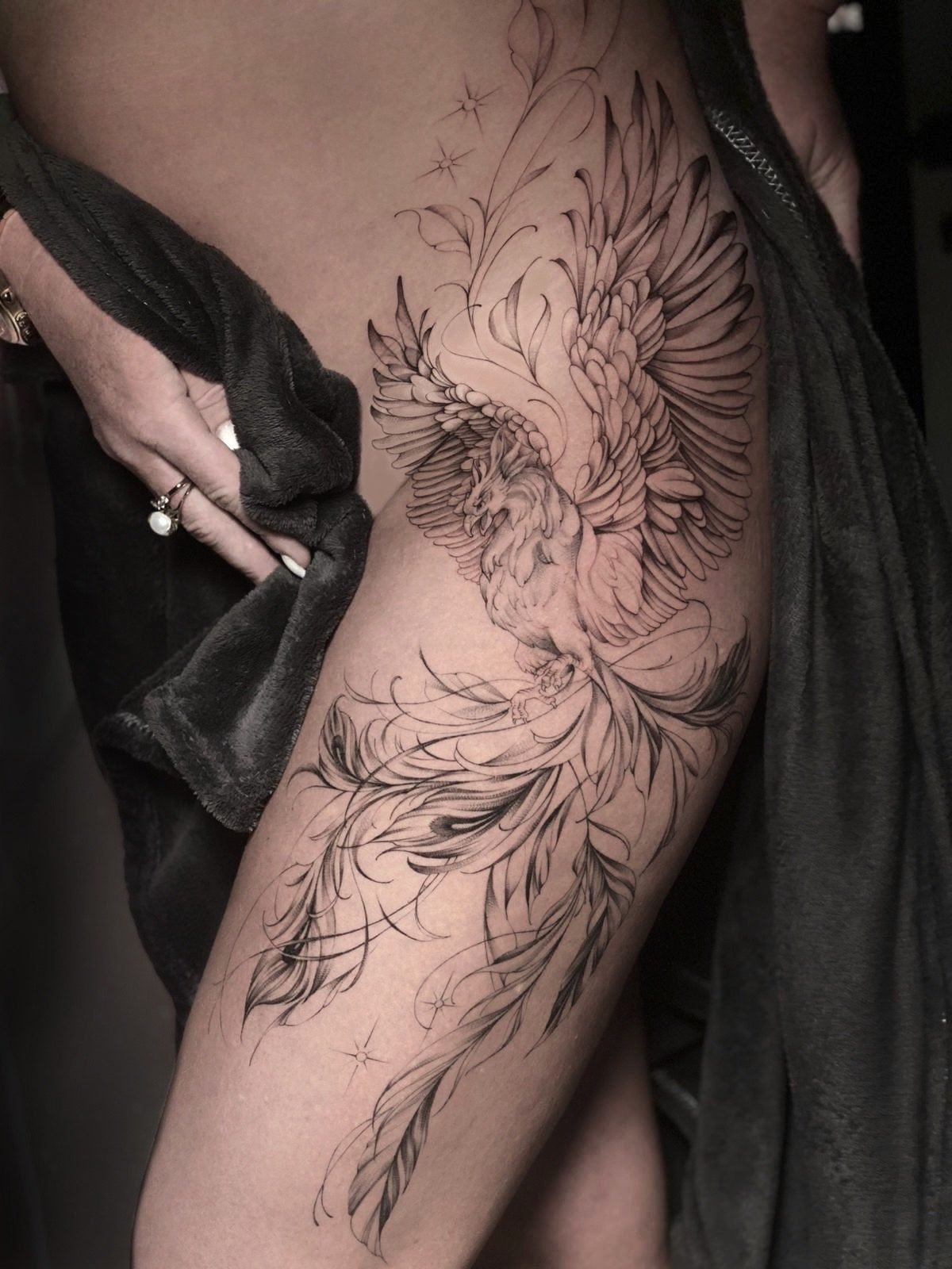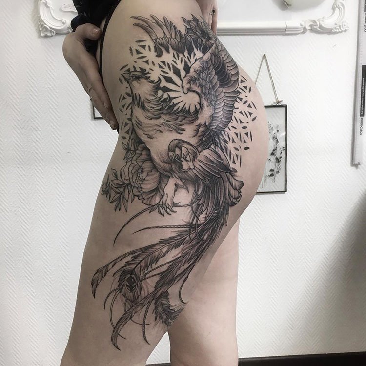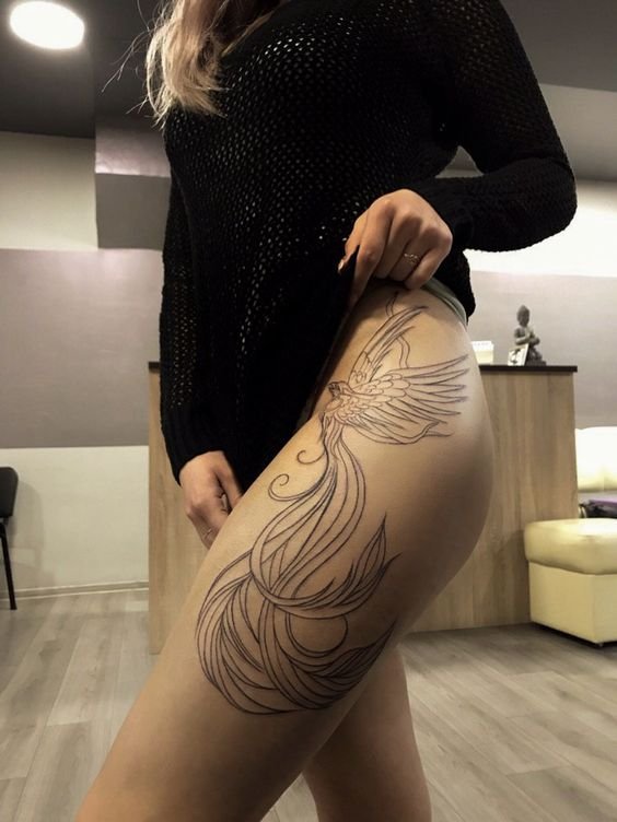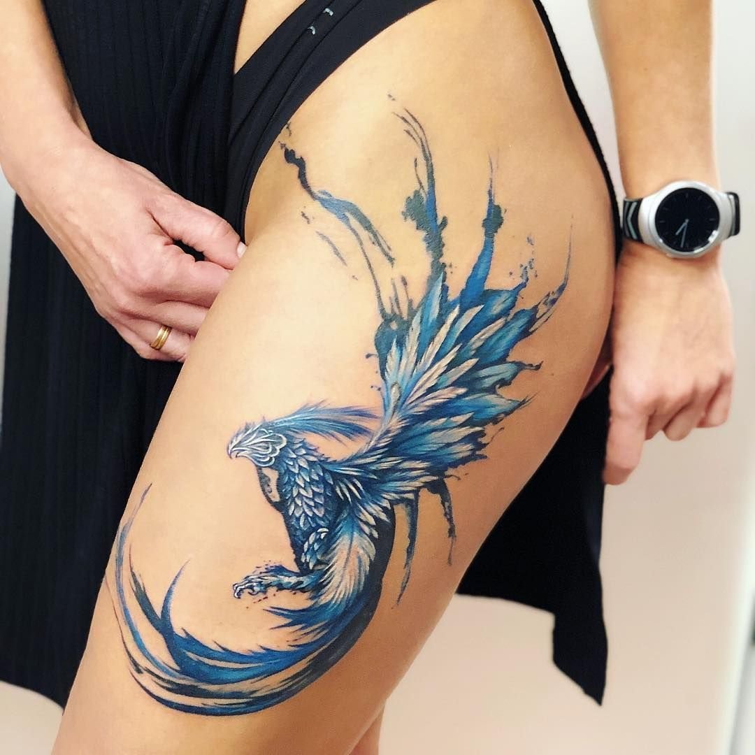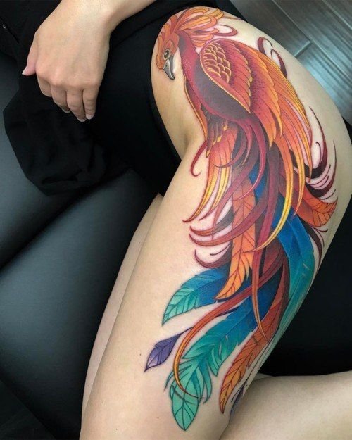 Това известно митично същество е способно да възкръсне от пепелта, а изображението му върху тялото символизира сила и нов период от живота. Фениксът, изработен в ярко оранжево и огненочервено, ще изглежда чудесно на бедрото.