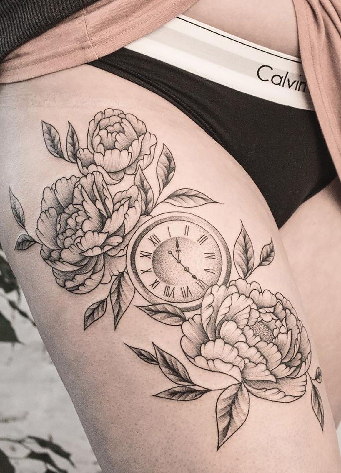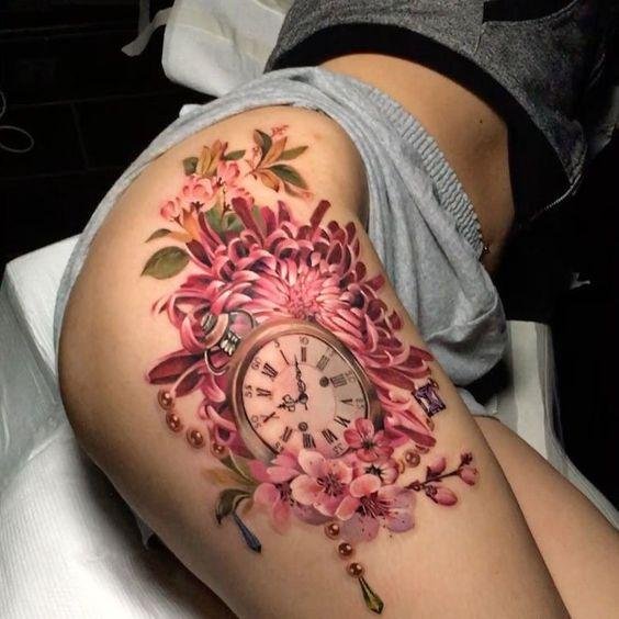 Часовниците изглеждат добре върху женските бедра. Те могат да бъдат отделна татуировка или да допълват друга композиция върху крака.